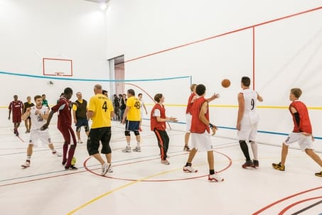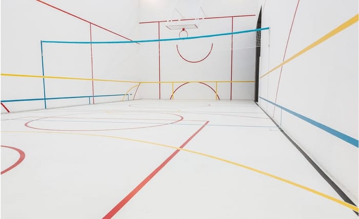 – Irene: He ido a hacer un taller en la exposición de Orbital Motion de Monika Grzymala en el Espacio de Arte Contemporáneo de Castellón. La artista juega con cintas adhesivas para dar tridimensionalidad al espacio. Eso me ha dado una idea… ¿como podemos redefinir las líneas de los campos polideportivos? Incluso, ¿como esa redefinición nos puede permitir crear nuevos espacios de juego? ¿Podemos redefinir las normas de los juegos a partir de la (de)construcción de las líneas?