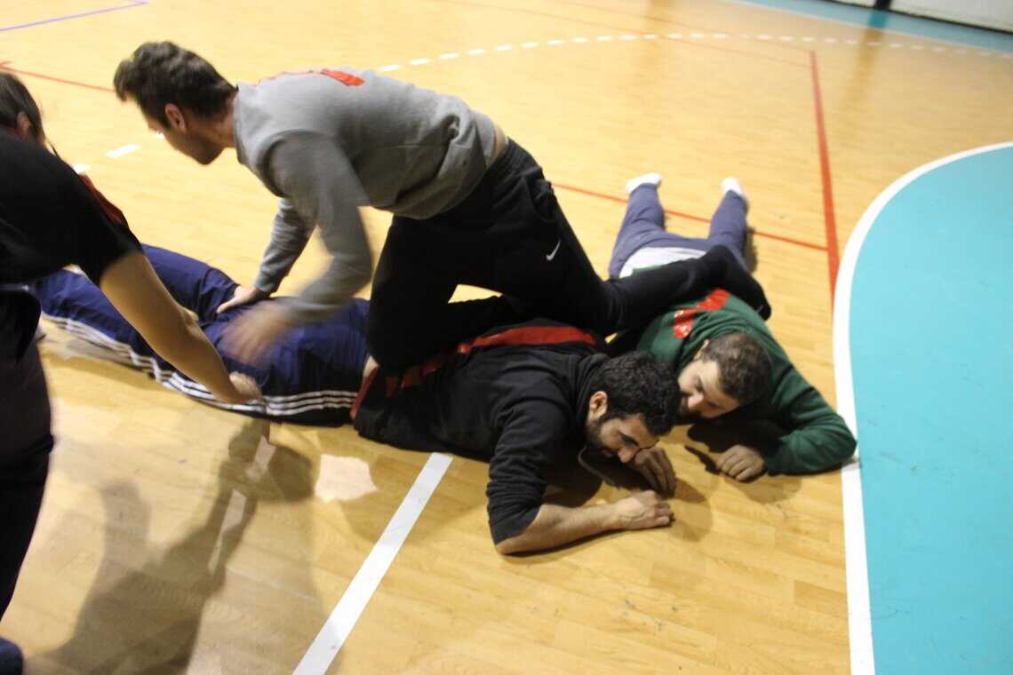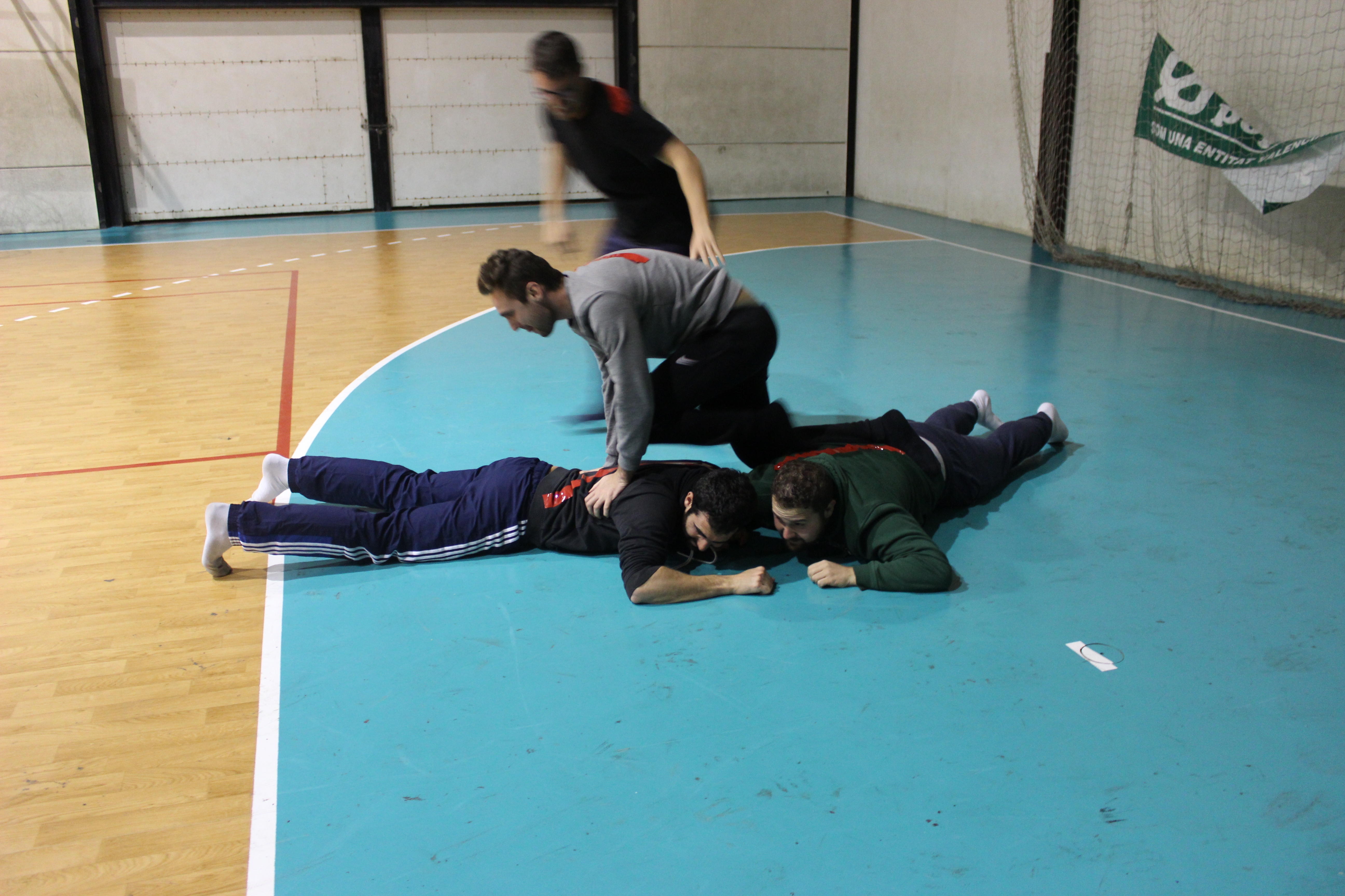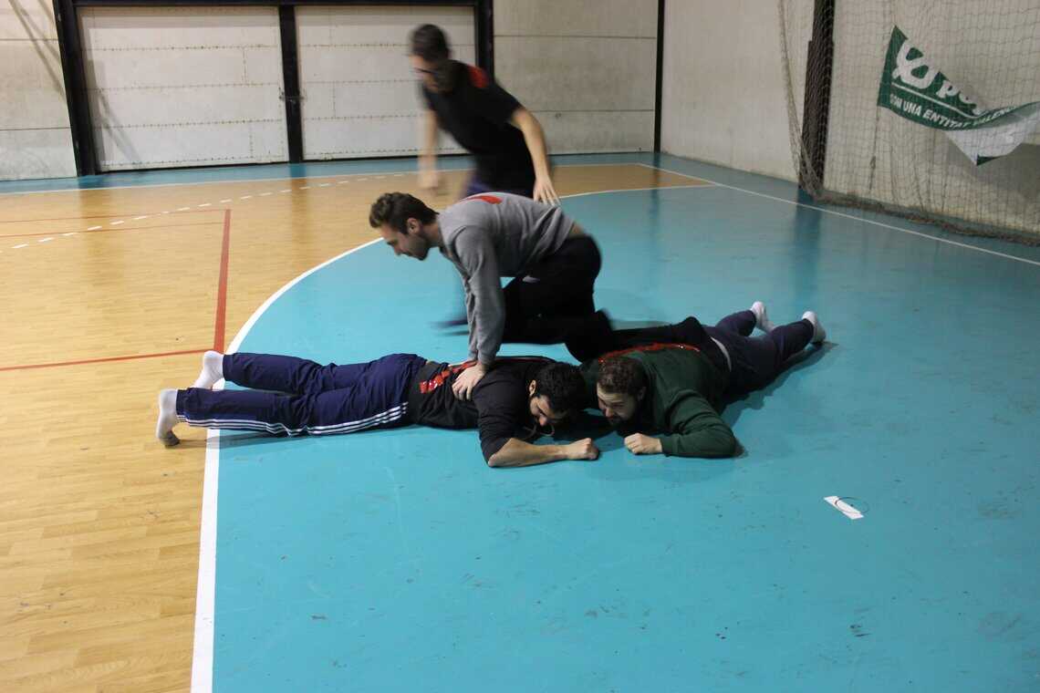 Hay condiciones. Una primera condición es que solo puede estar de pié un ayudante, los demás tienen que estar en el suelo. La segunda condición es que en ningún momento los ayudantes pueden estirarse encima de una línea que ya esté dibujada en el suelo. Sí, eso supone pisar a nuestros compañeros, por lo cual el capitán irá descalzo. (Lo de ir en cuidado también se avisó… pero el juego es algo serio y a veces no nos importa sufrir un poco para ganar…) Cuando el capitán de uno de los equipos tenga la bandera, tiene que volver a su base. Mientras tanto, el equipo contrario puede intentar tocar a las líneas del otro equipo para eliminarlos e intentar tocar al capitán rival.
