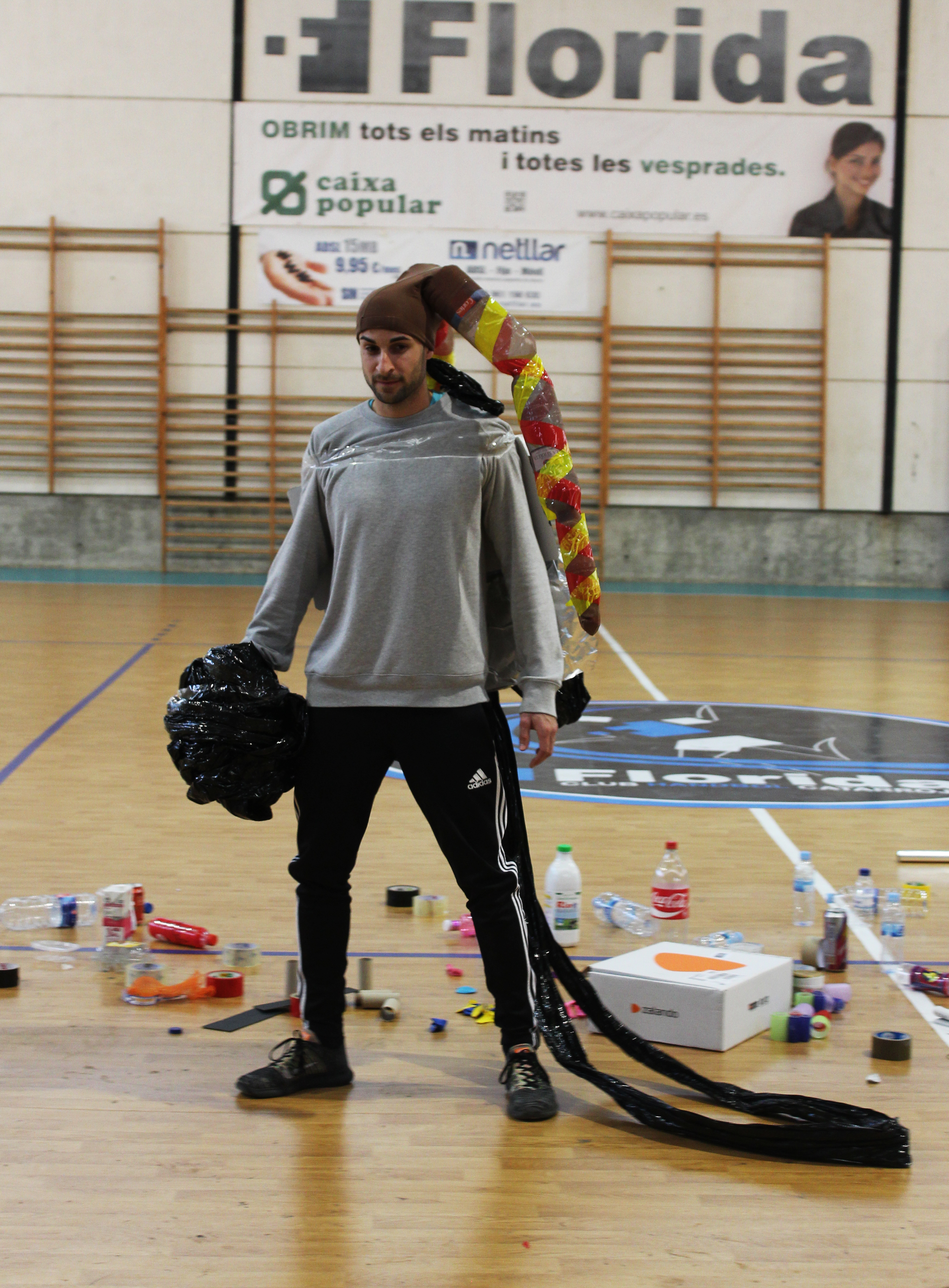 Para realizar las “prótesis” partiremos de materiales y objetos cuotidianos como pueden ser medias, cartones, globos, papeles, plásticos… y nuestro elemento estrella, ¡la cinta adhesiva! Con ella vamos a acoplar nuestras “prótesis a medida” a nuestro cuerpo. A