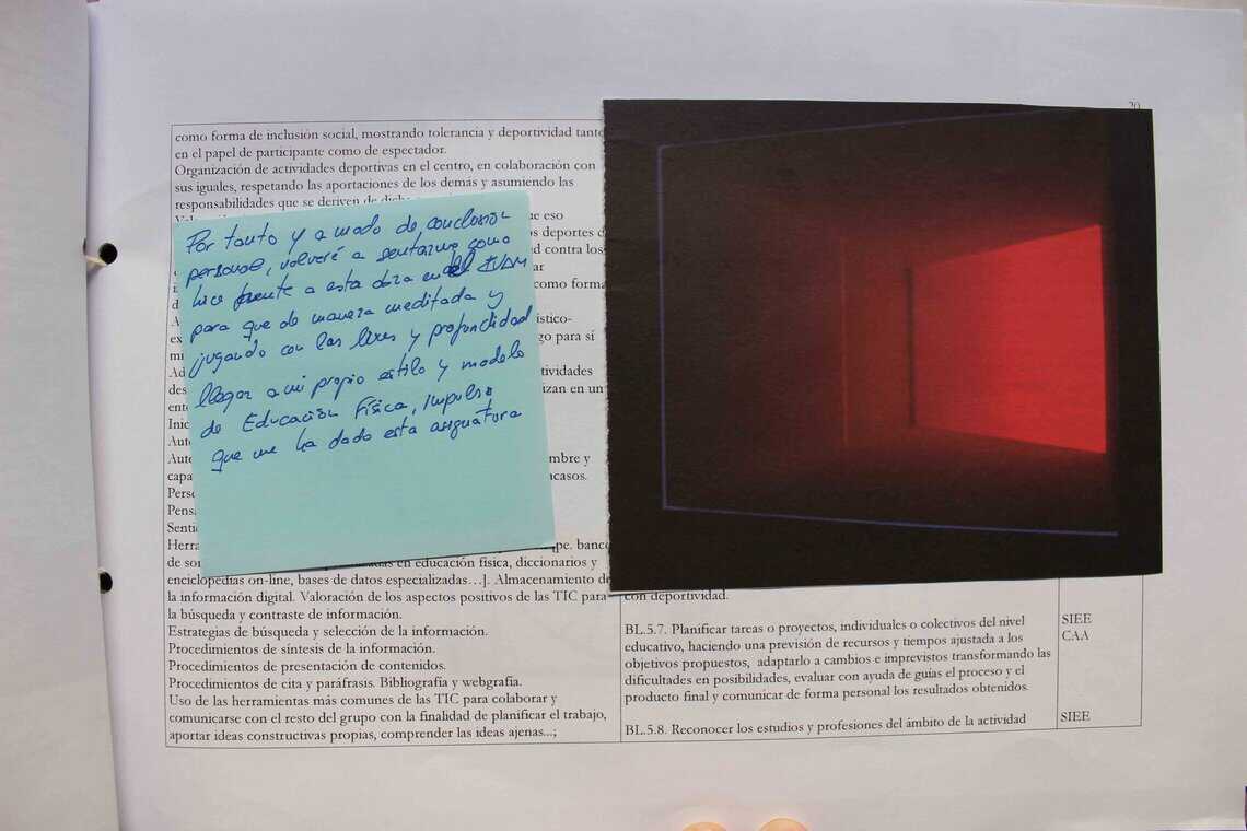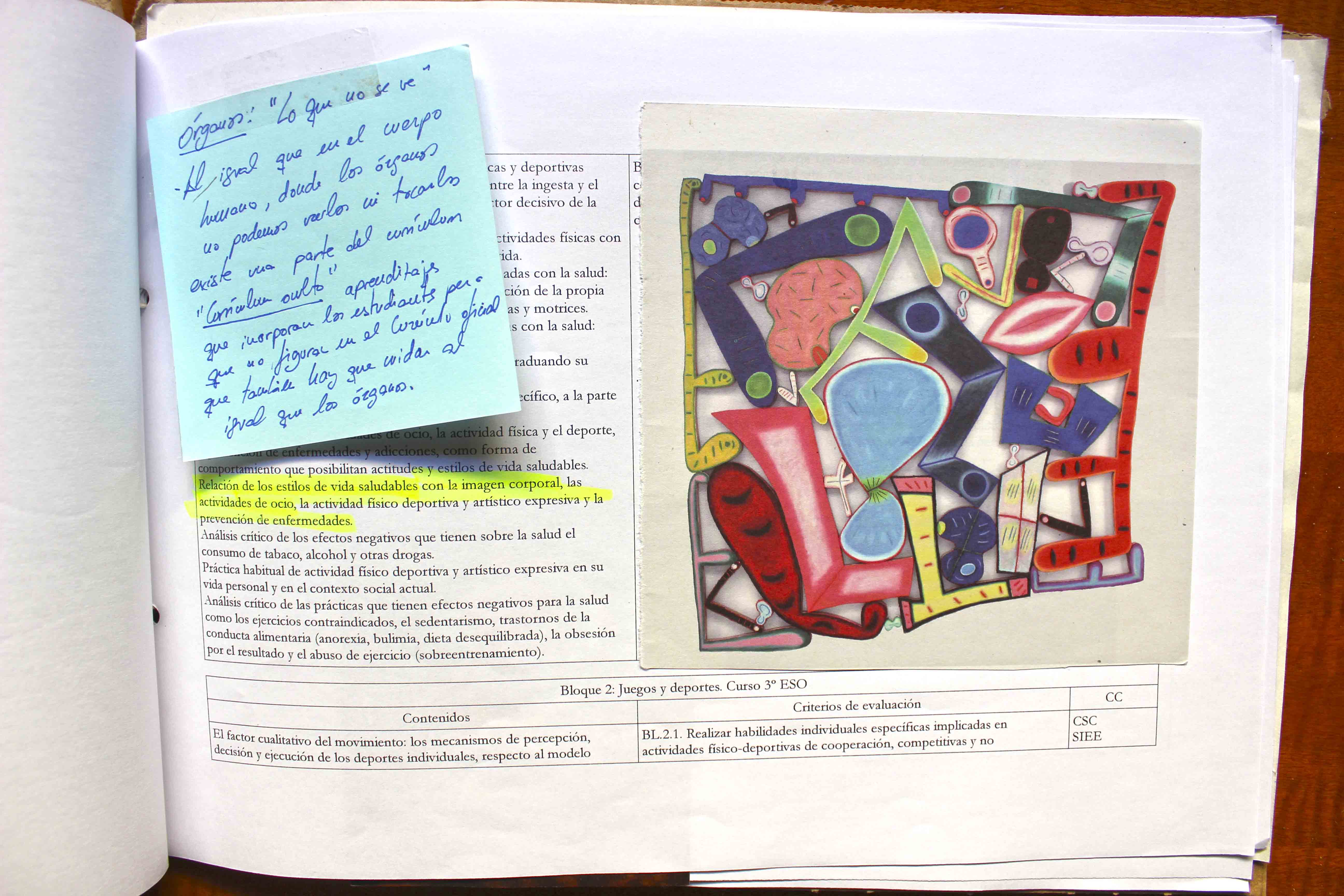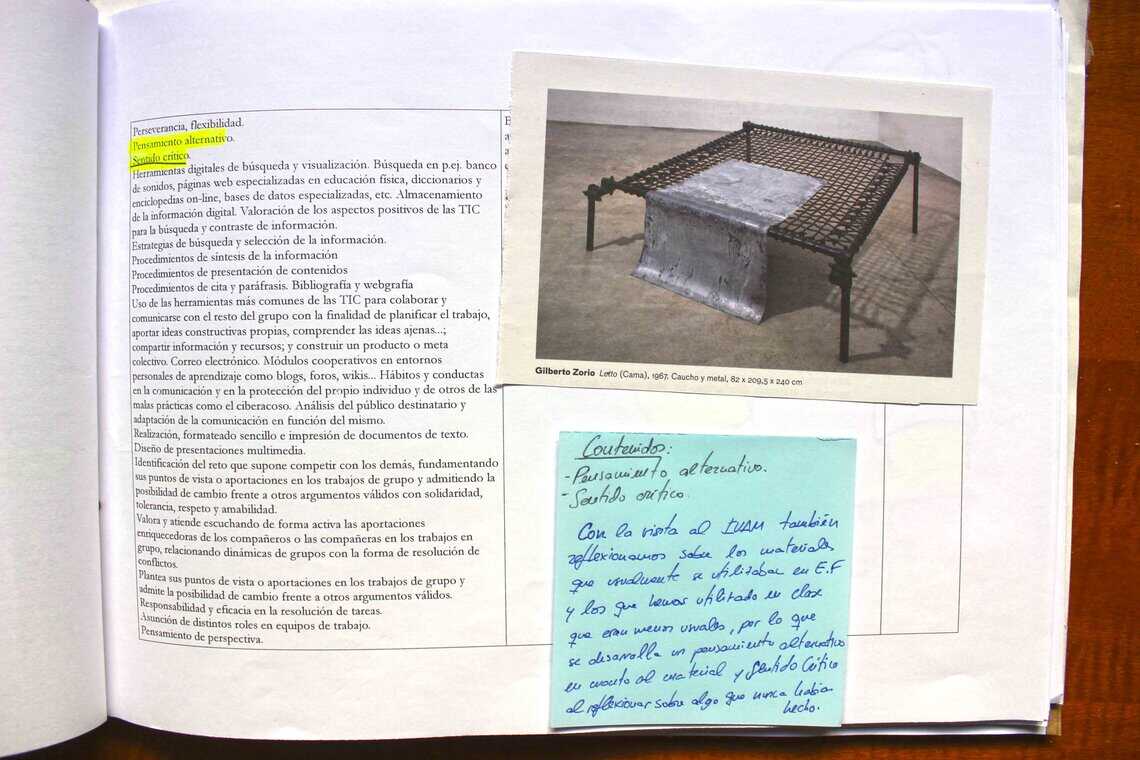 A partir de los estímulos que los estudiantes vivieron en el IVAM (ver entrada) y los que les proporcioné a partir de ejemplos de libros intervenidos artísticamente cada estudiante tenía que crear su propio libro-relato autobiográfico con el currículum de EF de secundaria. Los alumnos debían relacionar los contenidos del currículum que para ellos fueran más significativos y que pudieran relacionar con actividades que habíamos hecho al máster, con su escolarización o con su vida diaria. Además podían incorporar reflexiones críticas sobre distintos aspectos que habían aprendido en el máster o que observaran del propio currículum. Es cuando conectamos el YO con el contenido, que podemos generar aprendizajes significativos.