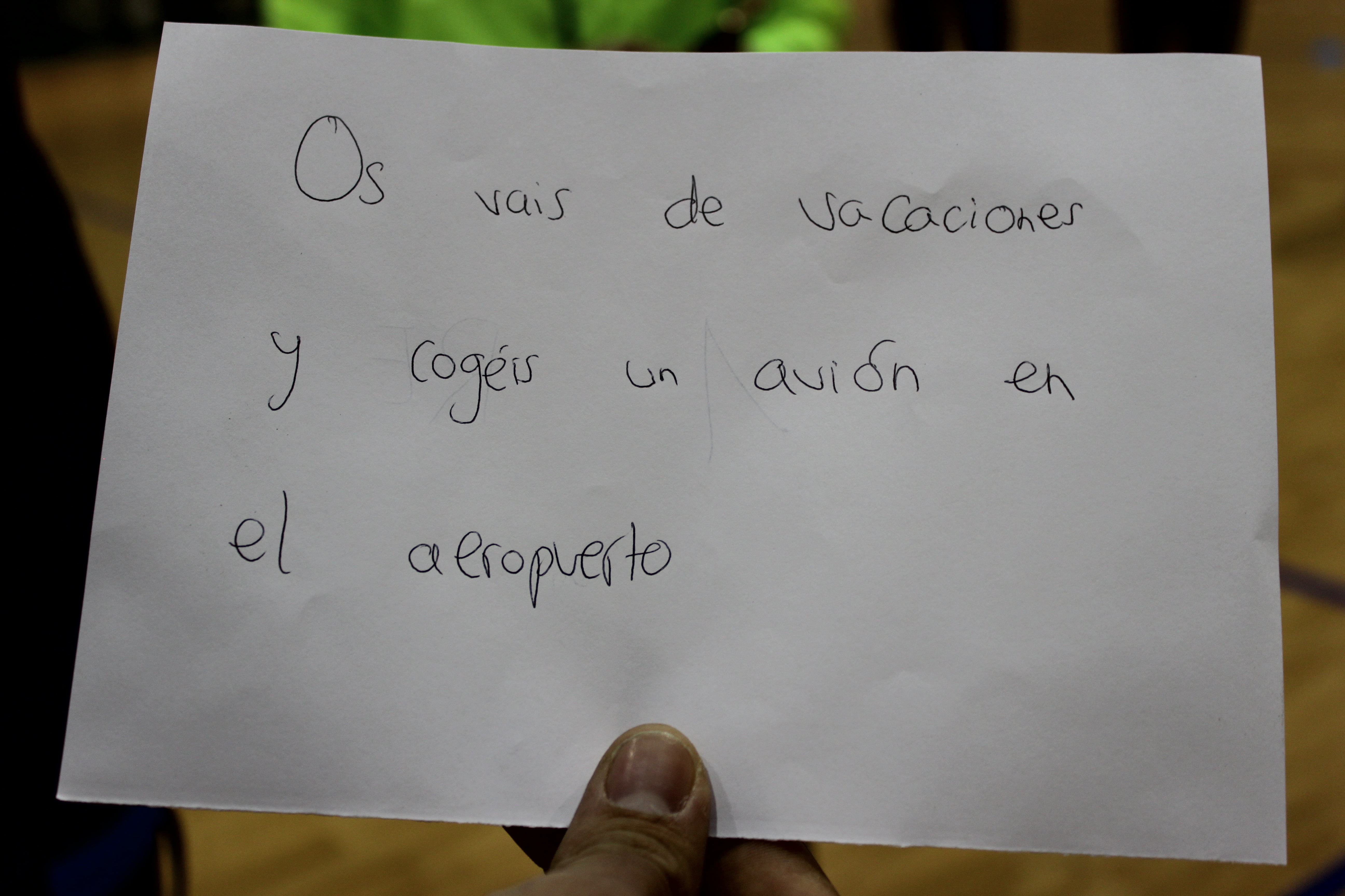Cada nota iba relacionada con un color, que correspondía a los colores de los conos. Por ejemplo, el sonido “do” se asociaba con el color naranja. En este caso, los alumnos trabajaban por grupos y cada vez que escuchaban la nota debían ir corriendo hacia el cono con color correcto. El grupo que llegaba último al cono debía coger una de las tarjetas que se encontraban junto a los conos. En cada una de las tarjetas había una frase que el grupo debía representar con mímica a sus compañeros. Para ello disponían de un tiempo para que sus compañeros lo adivinaran. El grupo que lo adivinaba, ganaba un punto.